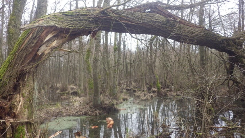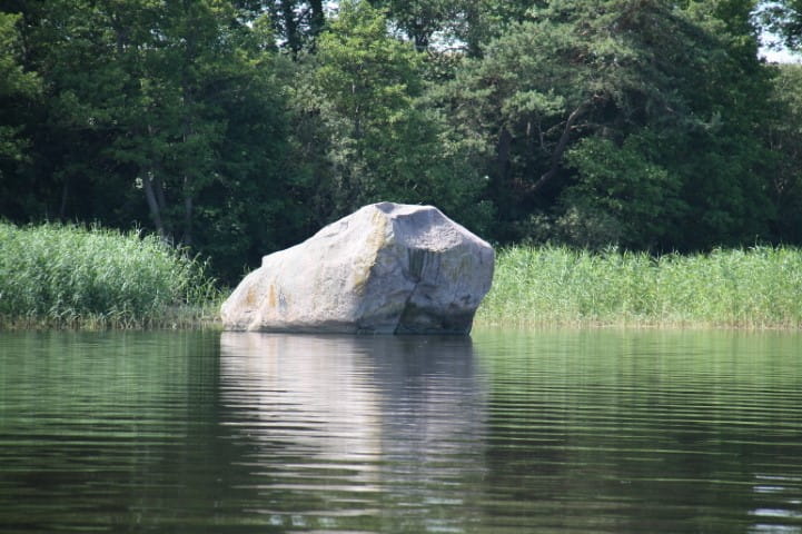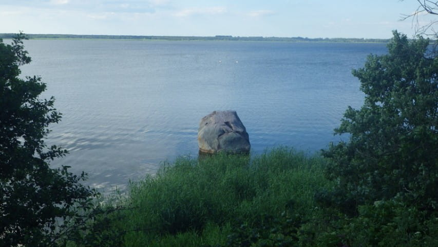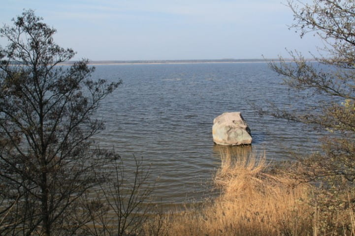 Naszą wędrówkę do Królewskiego Głazu, rozpoczynamy obok dworca kolejowego i autobusowego w Kamieniu Pomorskim. Dochodzimy do ulicy Mieszka I. Tutaj węzeł z niebieskim szlakiem pieszym i Pomorską Drogą Świętego Jakuba. Nie idziemy za znakami - w wyniku inwestycji budowlanej nie ma przejścia. Teraz idziemy w prawo za oznakowaniem Szlaku Jakubowego, lewym chodnikiem. Przechodzimy rondo i na kolejnym skrzyżowaniu skręcamy w lewo - ulica E. Orzeszkowej - Szlak Jakubowy odbija w prawo. Początkowo chodnikiem, potem poboczem asfaltowej drogi docieramy do mostu nad Promną - odnogą Dziwny. Przechodzimy i znajdujemy się na wyspie. Wyspa Chrząszczewska, jest trzecią, co do wielkości wyspa w Polsce. Znajduje się w obszarze NATURA 2000 - Ujście Odry i Zalew Szczeciński. W czasie II Wojny Światowej, wyspa stanowiła schronienie wycofujących się Niemców. Od 6 marca 1945 roku, po wycofaniu się z Kamienia Pomorskiego i wysadzeniu mostu, bronili oni wyspy przed wojskami radzieckimi. Powstały bunkry, okopy strzeleckie i stanowiska artyleryjskie. W utrzymaniu wyspy przez Niemców pomagało silne zgrupowanie wojskowe na wyspie Wolin, które zostało rozbite dopiero 4 maja 1945 roku. Obrona trwała do 22 kwietnia 1945 roku. Z małego portu w Buniewicach (dawny port kopalni wapienia), niemieccy cywile oraz wojsko przeprawiali się przez Dziwnę. Tą samą drogą docierało na wyspę zaopatrzenie. Do dzisiejszego dnia można spotkać poszukiwaczy skarbów, szukających kosztowności przedwojennych mieszkańców okolic Kamienia Pomorskiego, jak i fantów wojennych. Szkoda że port w Buniewicach nie został oczyszczony z niewybuchów i min, gdyż na pewno stanowiłby ciekawą alternatywę postoju miłośników turystyki wodnej. Na Wyspie Chrząszczewskiej umiejscowione były podobno wyrzutnie rakiet V (na górze obok Buniewic - przed wojną kopalni wapienia), zbombardowane przez rosyjskie lotnictwo. W czasie II Wojny Światowej, stacjonowało tu również wojsko - w budynkach dawnej fabryki mieściły się magazyny amunicji - pewnie to ich zawartość znajduje się w dużej części w buniewickim kanale. Kolejną atrakcją i zarazem największą jest Królewski Głaz, ale o tym później. Warto wspomnieć, że wyspa pełniła również rolę cmentarza plemion kultury pucharów lejkowatych zamieszkujących pobliskie tereny na wyspie Wolin i w okolicach Kamienia Pomorskiego. Niestety stanowiska kurhanowe, zostały mocno zniszczone. Mijając tor crossowy i pozostałości zabytkowego cmentarza poniemieckiego (również pozostałości pomnika poświęconego mieszkańcom wyspy, którzy zginęli podczas I Wojny Światowej), dochodzimy do Chrząszczewa.