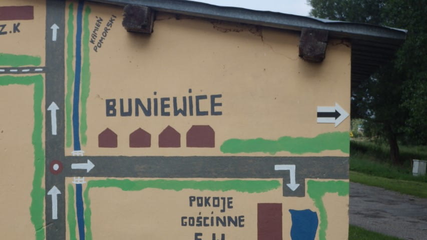 Jeśli zdecydowaliśmy się na dalszą wędrówkę szlakiem, ruszamy drogą polną, przechodzącą w gruntową. Po lewej, na wzniesieniu widzimy kępę drzew, obrośniętych bluszczem. Tam znajduje się poniemiecki cmentarz ewangelicki. Niestety dość mocno zniszczony - liczę że mieszkańcy, kiedyś go uporządkują, a z ziemi wyciągną nagrobki i krzyże, przedwojennych mieszkańców wyspy, tworząc lapidarium. Wędrujemy wzdłuż nadjeziornej linii drzew. Nasza droga zanika, wędrujemy koleinami rolniczych maszyn. Dość nieprzyjemny fragment szlaku. Przed Buniewicami wchodzimy w lasek (po prawej znajduje się cmentarzysko szkieletowe. Docieramy do betonowej drogi i skręcamy w lewo - w prawo znajduje się maleńka zatoczka. Po lewej mijamy ruiny dawnego PGR-u, oraz ciekawy budynek dawnej szkoły - obecnie mieszkalny. Ceglany gmach, zbudowano na kamiennym fundamencie - pewnie ma już ponad 100 lat. Dochodzimy do malowniczego przystanku autobusowego - Na wiacie namalowana jest mapka sołectwa Buniewice. Skręcamy w prawo i wchodzimy do centrum Buniewic. To właśnie tutaj, w okresie II Wojny Światowej, znajdował się mały port dawnej cementowni, wykorzystywany do przepraw wojsk i mieszkańców niemieckich. Na niedalekim wzniesieniu g. Wyżyna znajdowało się jeszcze w XIX w. aż 18 megalitów, zbudowanych z ok. 10 głazów ustawionych w kręgi. Jeden z nich miał jeszcze zachowany nasyp kurhanu. Zostały całkowicie zniszczone przy wydobyciu kredy do cementowni w Buniewicach, czego świadkiem pozostaje do dziś podmokły krater. Wiadomo też, że na północ od wsi wysadzono w powietrze, jeszcze co najmniej jeden grobowiec, a ślady osadnicze kultury pucharów lejkowatych znalezione w południowo-zachodniej części wyspy i w jej otoczeniu sugerują, że była ona miejscem uświęconym dla mieszkańców ówczesnego Wolina, którzy zapewne przepływali Dziwnę by odprawiać tu swoje obrzędy, chować zmarłych i czcić bogów Królewskiego Kamienia. Idąc asfaltem mijamy sklep, w którym gościnny właściciel, na pewno przekaże Wam sporo dziejów historycznych wyspy, oraz sprzeda oczywiście artykuły spożywcze. Po około kilometrze dochodzimy do większego skrzyżowania. Wchodzimy na drogę betonową, kierując się z powrotem do Chrząszczewa. Na skrzyżowaniu, nasz szlak kończy/rozpoczyna swój bieg. Tak jak przyszliśmy, wracamy z powrotem do Kamienia Pomorskiego (3,4km).