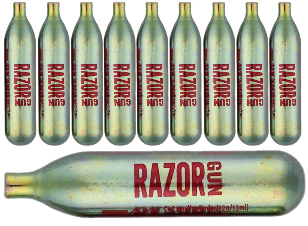 Sprawdzone i cenione przez miłośników wiatrówek naboje marki RazorGun CO2 12gram, przeznaczone są do wiatrówek, które wyrzucają śrut dzięki kontrolowanemu uwalnianiu sprężonego dwutlenku węgla. 1 nabój wystarcza przeważnie na wystrzelenie ok. 50-60 śrutów, tak więc chcąc wystrzelać zawartość typowej paczki śrutu powinieneś mieć przy sobie co najmniej 10 naboi Co2 12g. Niektóre pistolety i karabinki ASG, oraz markery paintballowe również wykorzystują naboje CO2 12g.