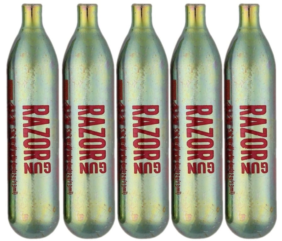 Sprawdzone i cenione przez miłośników wiatrówek naboje marki RazorGun CO2 12gram, przeznaczone są do wiatrówek, które wyrzucają śrut dzięki kontrolowanemu uwalnianiu sprężonego dwutlenku węgla. 1 nabój wystarcza przeważnie na wystrzelenie ok. 50-60 śrutów, tak więc chcąc wystrzelać zawartość typowej paczki śrutu powinieneś mieć przy sobie co najmniej 10 naboi Co2 12g. Niektóre pistolety i karabinki ASG, oraz markery paintballowe również wykorzystują naboje CO2 12g.